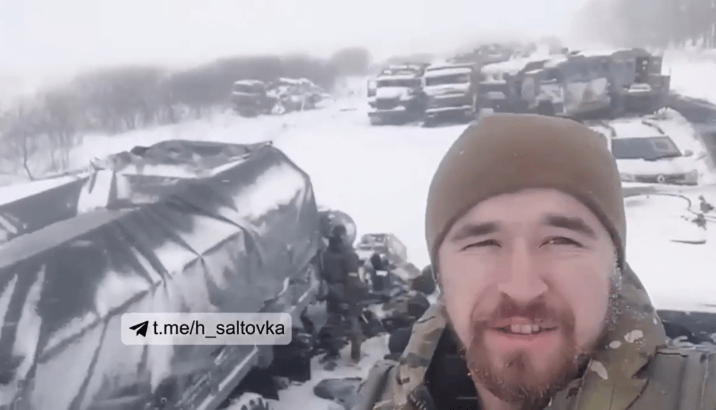 «Сейчас покажу, как должен выглядеть российский оккупант на территории Украины… Кто боится этих машин с буквами Z, вот смотрите, они все стоят позади, дальше они ехать пока не собираются», — рассказывает наш боец.